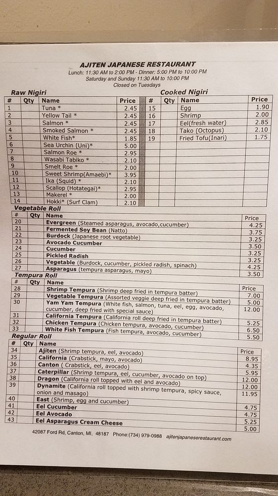 Aji Ten Japanese Restaurant, located in Canton, MI, offers a wide range of Japanese cuisine in a casual and welcoming setting. Known for its exceptional quality and diverse menu, this restaurant caters to both lunch and dinner crowds. The menu features cold and hot appetizers like Hiyayakko and Tonkatsu, as well as delicious soups and salads such as Miso Soup and Hiyashi Wakame Salad. Customers rave about the Gyudon Bowl, agedashi, sushi, ramen, and chicken Katsu. The attentive staff provides quick and polite service, making it a great choice for a meal with friends or family. Whether you're a sushi enthusiast or simply craving authentic Japanese flavors, Aji Ten is a hidden gem worth exploring. Highly recommended for those seeking a memorable dining experience.